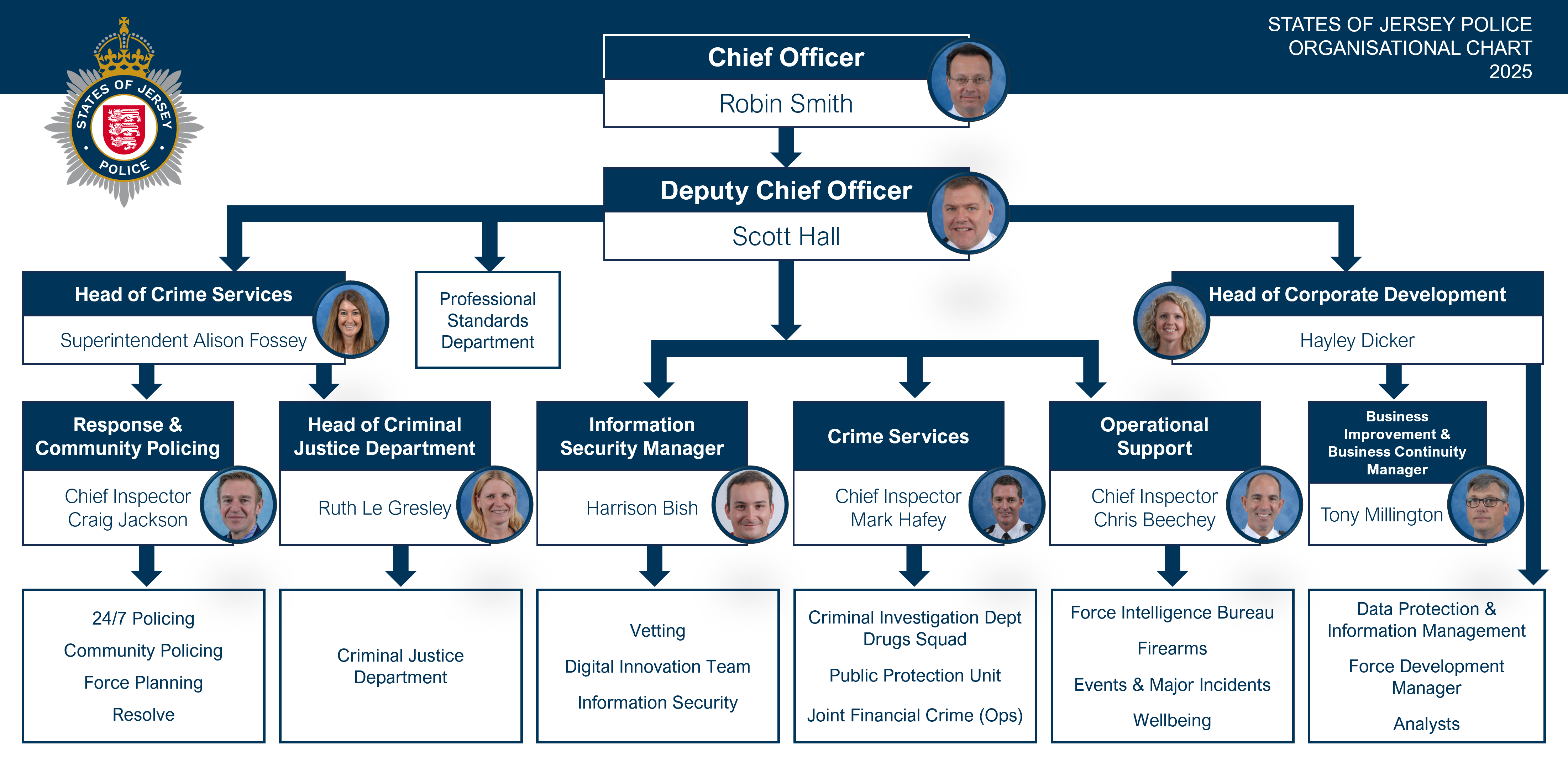 Robin Smith was appointed Chief in 2019 and has overall responsibility for the States of Jersey Police. His priorities are tackling crime and anti-social behaviour, protecting the public from harm, apprehending criminals, providing a visible and efficient policing service, and supporting SoJP’s committed workforce.